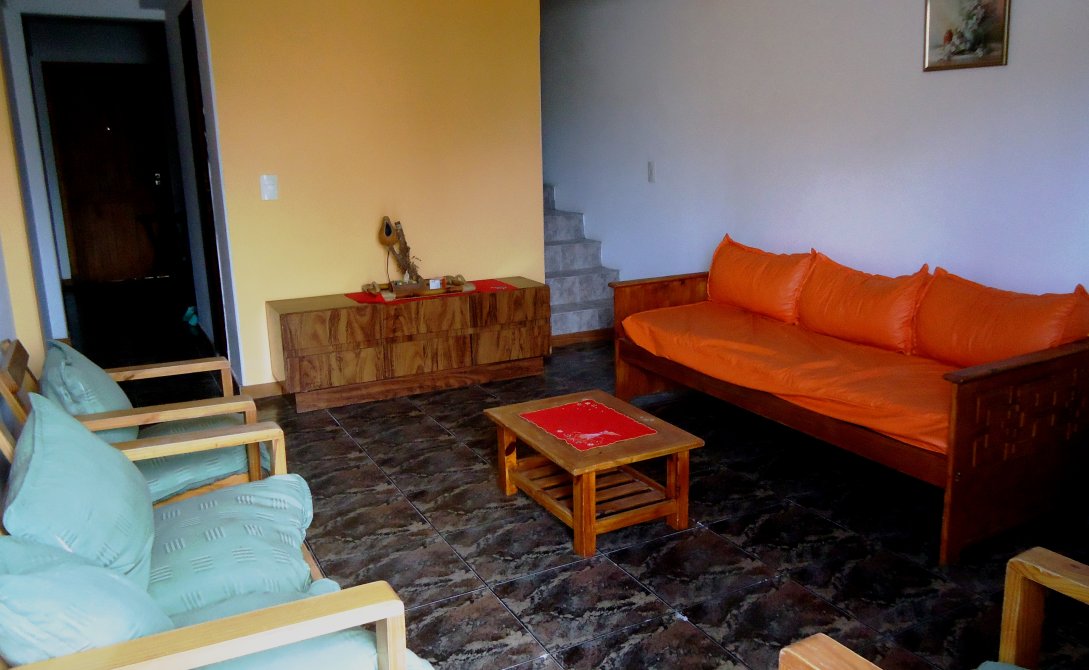 En planta baja: Living amplio con divan cama con colchon de una plaza y jueo de sillones, cocina - comedor con mesa y sillas, heladeray artefacto cocina.