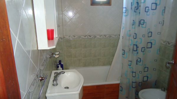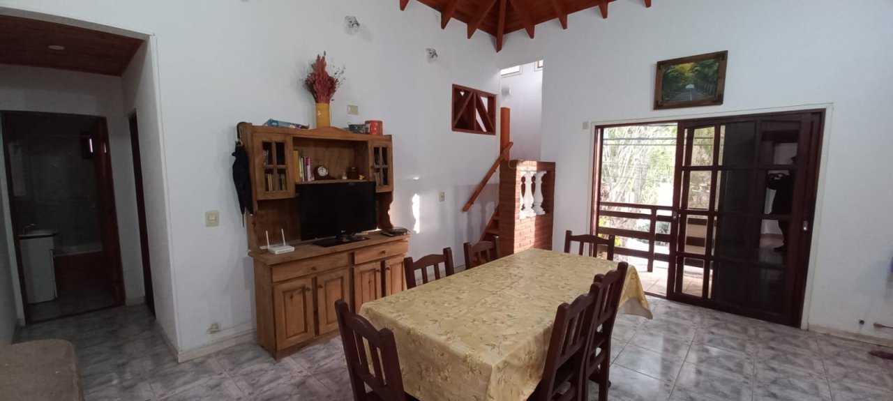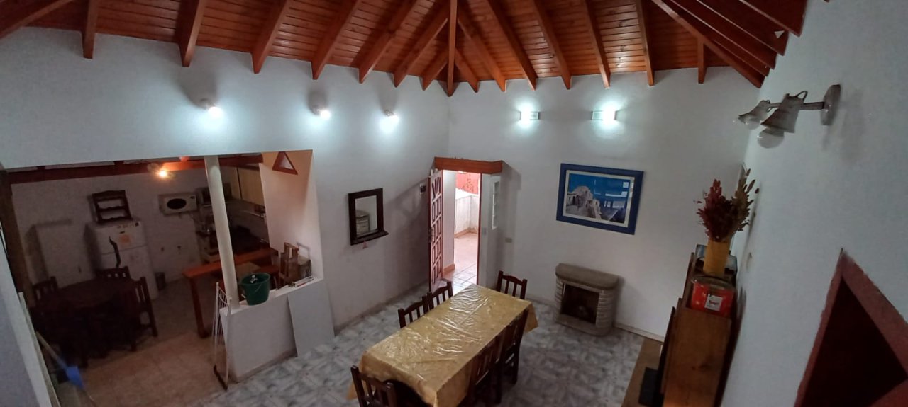 Amplio living con mesa, sillas, hogar. Luego podemos ver que tiene una baño completo con bañera