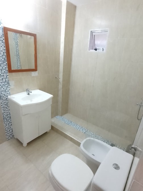 Baño completo ( con videt y ducha) y placard empotrado. Terraza del edificio con zona de parrillas.