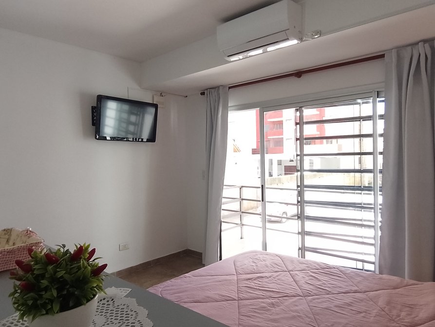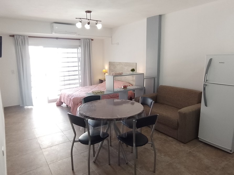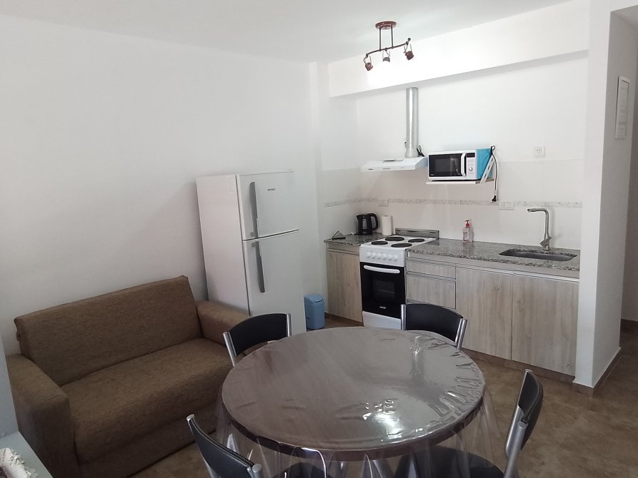 Mesa y sillas haciendo juego, sofa cama y cocina icompleta con Artefacto cocina, termotanque, microondas, Heladera y Pava electrica.