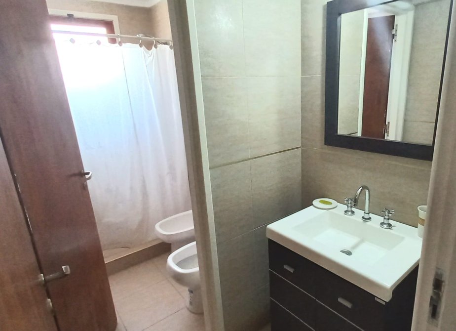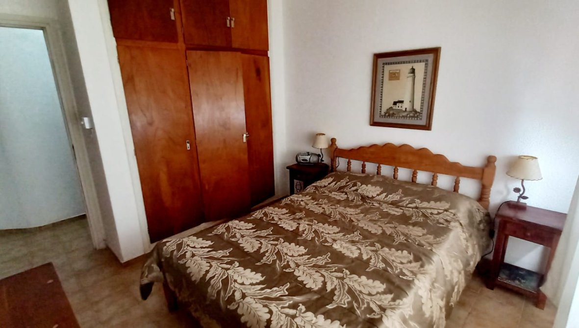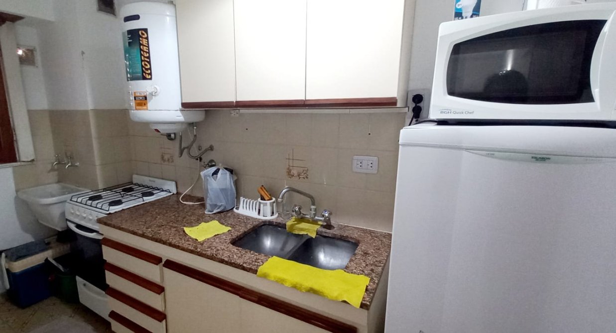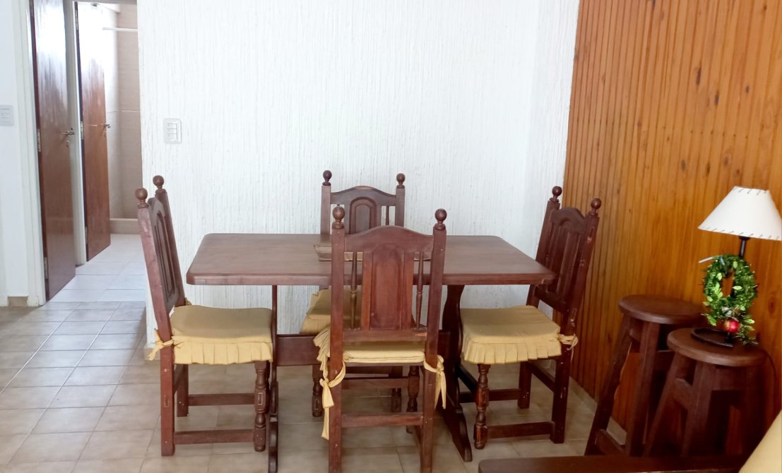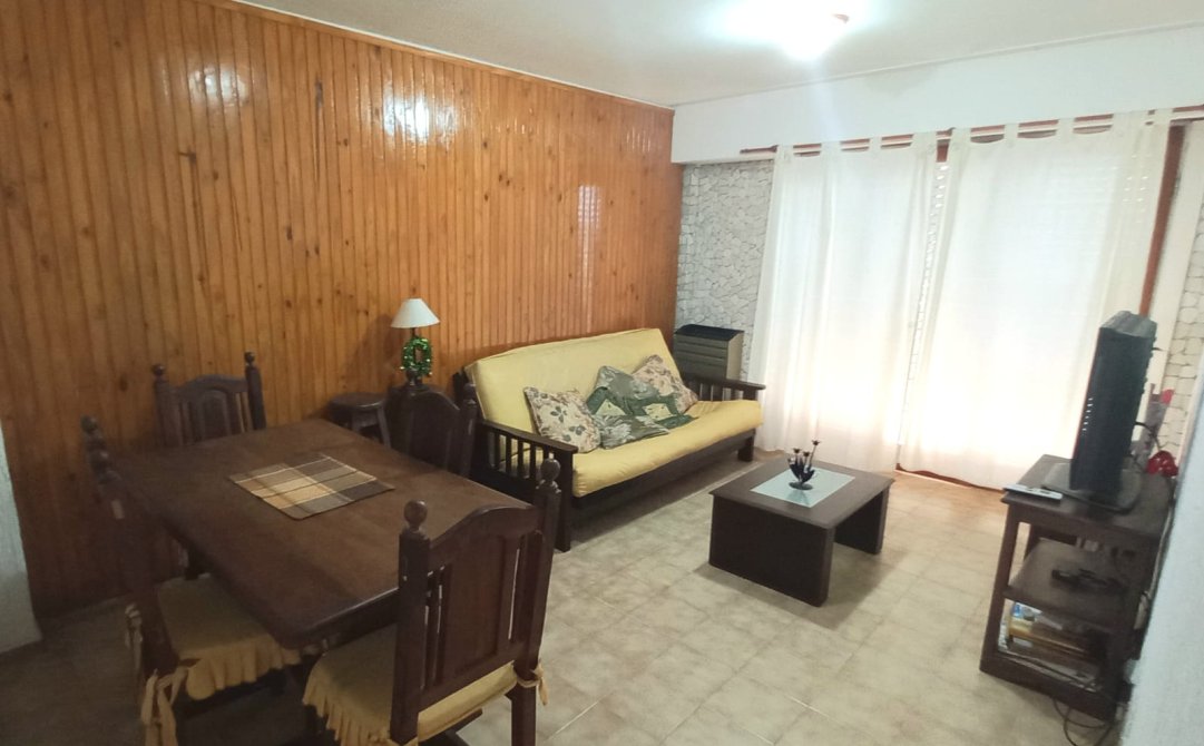 Departamento de 2 ambientes amplios, tinene Un Dormitorio con ama de dos plazas, placard empotrado y Juego de dormitorio. Living-comedor con futon de algarrobo y colchon de 2 plazas, juego de comedor de algarrobo con sillas haciendo juego. Cocina separada, con artefacto cocina, termotanque electrico, Heladera, microodas, mesada y pileta. Ante baño y baño refaccionados a nuevo. Con arteactos en muy buen estado. Amplio alcon con vista al mar.