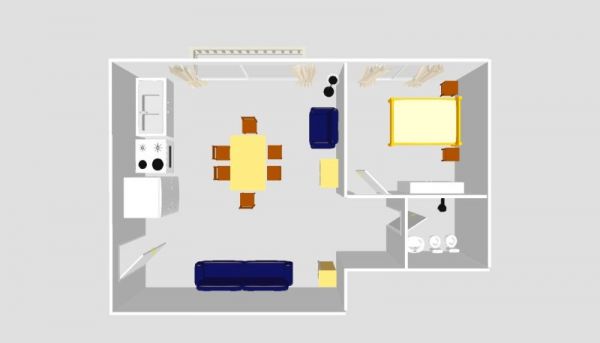 Cocina-comedor con divan cama de una plaza, un sillon cama individual, termo electrico y Baño completo.